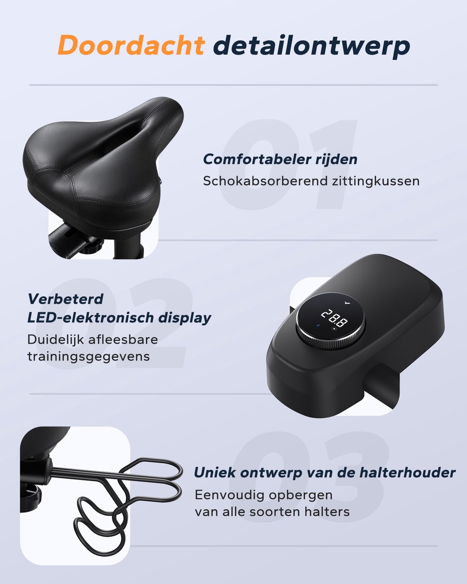 De hometrainer heeft een speciale houder voor verstelbare halters, veiligheidsstangen en fleshouders, bedoeld als praktische opbergruimte tijdens je training. Deze houder is geschikt voor het tijdelijk opbergen van accessoires, maar het is verstandig geen zware losse gewichten langdurig op de houder te laten staan. Gebruik de houder volgens de handleiding en zorg dat opgeslagen accessoires de stabiliteit of bewegingsvrijheid tijdens het fietsen niet belemmeren.